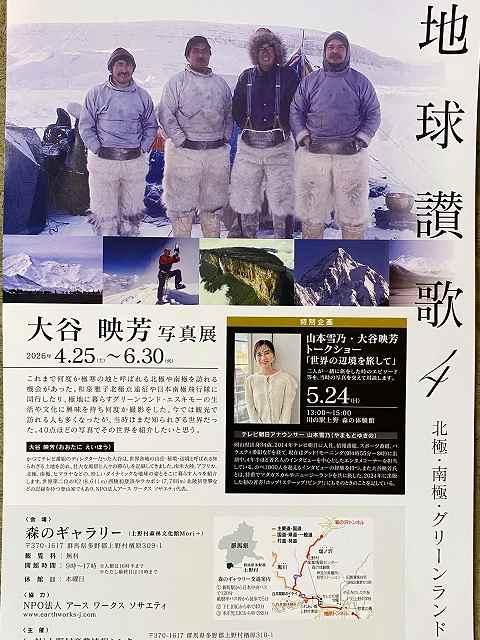 ──────────────────────────────── ▼・・・≪3.上野村森のギャラリー 写真展「地球賛歌 北極・南極・グリーンランド」≫・・・▼ ───────────────────────────────────── 上野村森のギャラリー第1回目写真展「地球賛歌 北極・南極・グリーンランド」が 5月24日 (日)にはトークショー「北極南極グリーンランド」山本雪乃+大谷映芳 が行われます。 ───────────────────────────────── ▼・・・・・・・・・・≪4.ドルポ Roots of Life 建設計画募金開始≫・・・・・・・・・・・・・・・・▼ ───────────────────────────────── すでに会員の皆様のお手元にネパール、ドルポでのRoots of Life プロジェクトのご案内が 届いていると思います。本計画をご理解の上、なにとぞご支援をよろしくお願いいたします。 ─────────────────────────────────